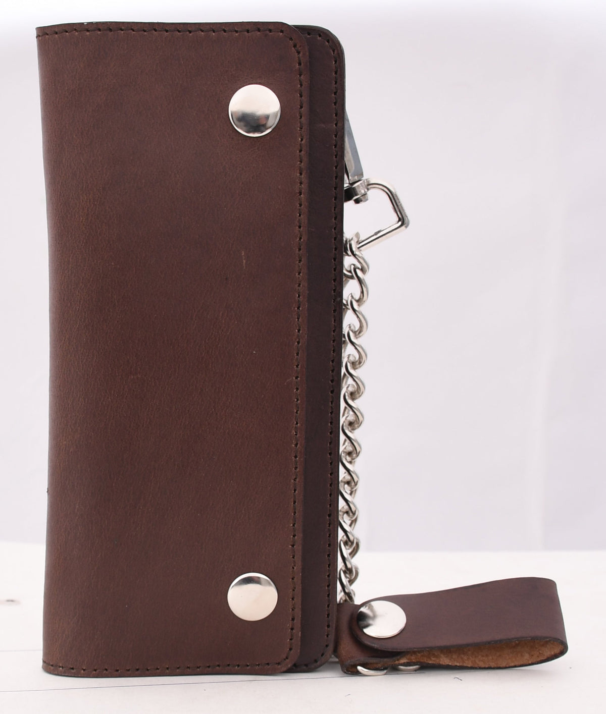 The Large Trucker wallet is the accessory of choice for the confident man who values practicality. This large male wallet rich brown tint is a versatile choice, while its size and proportions make an impact when visible from the back pocket of your jeans or chinos. Designed to carry your daily necessities effortlessly, it has a single card slot, a zip pocket, and two large open pockets, all protected by a double snap closure for added security. The rust-resistant 15-inch chain adds an edgy touch, but is removable should you desire a slimmer silhouette or prefer to exchange it with your own. This leather wallet for gents is crafted as a byproduct from our belt division so it is a sustainable choice for the conscious consumer.