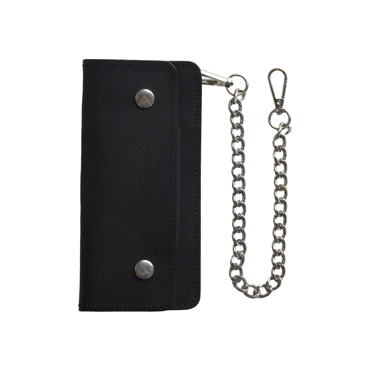The Large Trucker wallet is the accessory of choice for the confident man who values practicality. It boasts a black hue with a lot of depth, while its size and proportions make an impact when visible from the back pocket of your jeans or chinos. Designed to carry your daily necessities effortlessly, it has a single card slot, a zip pocket, and two large open pockets, all protected by a double snap closure for added security. The rust-resistant 15-inch chain adds an edgy touch, but is removable should you desire a slimmer silhouette or prefer to exchange it with your own. This leather wallet for gents is crafted as a byproduct from our belt division so it is a sustainable choice for the conscious consumer.