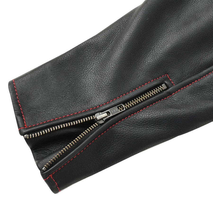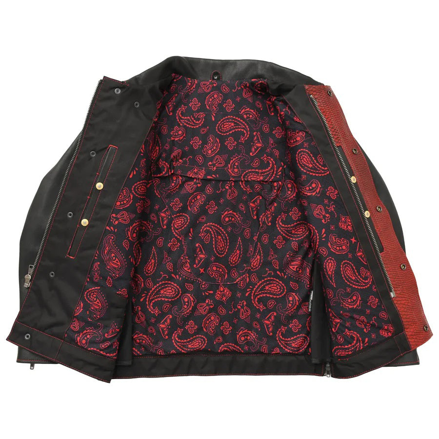 Meet the Redstrike, a bold motorcycle leather jacket built for riders who want performance and unmistakable style. This jacket combines black drum-dyed cowhide with a striking red diamond-quilted body for a look that stands out on every ride. The Redstrike includes conceal carry pockets, armor pockets, a comfortable action back, underarm vents, and a breathable mesh lining with custom paisley print. Whether you’re on the highway or cruising through town, this jacket delivers premium comfort, durability, and attitude.